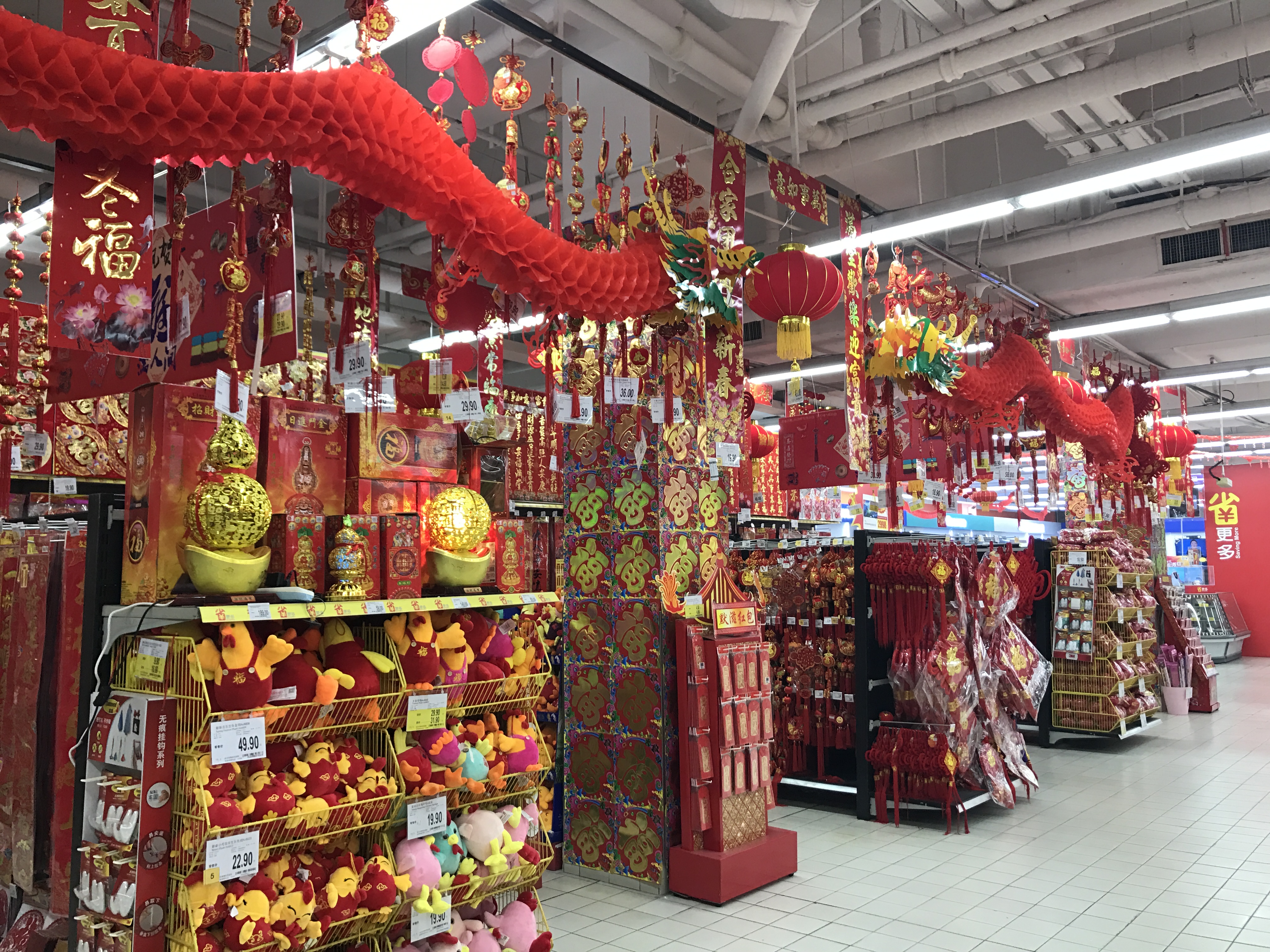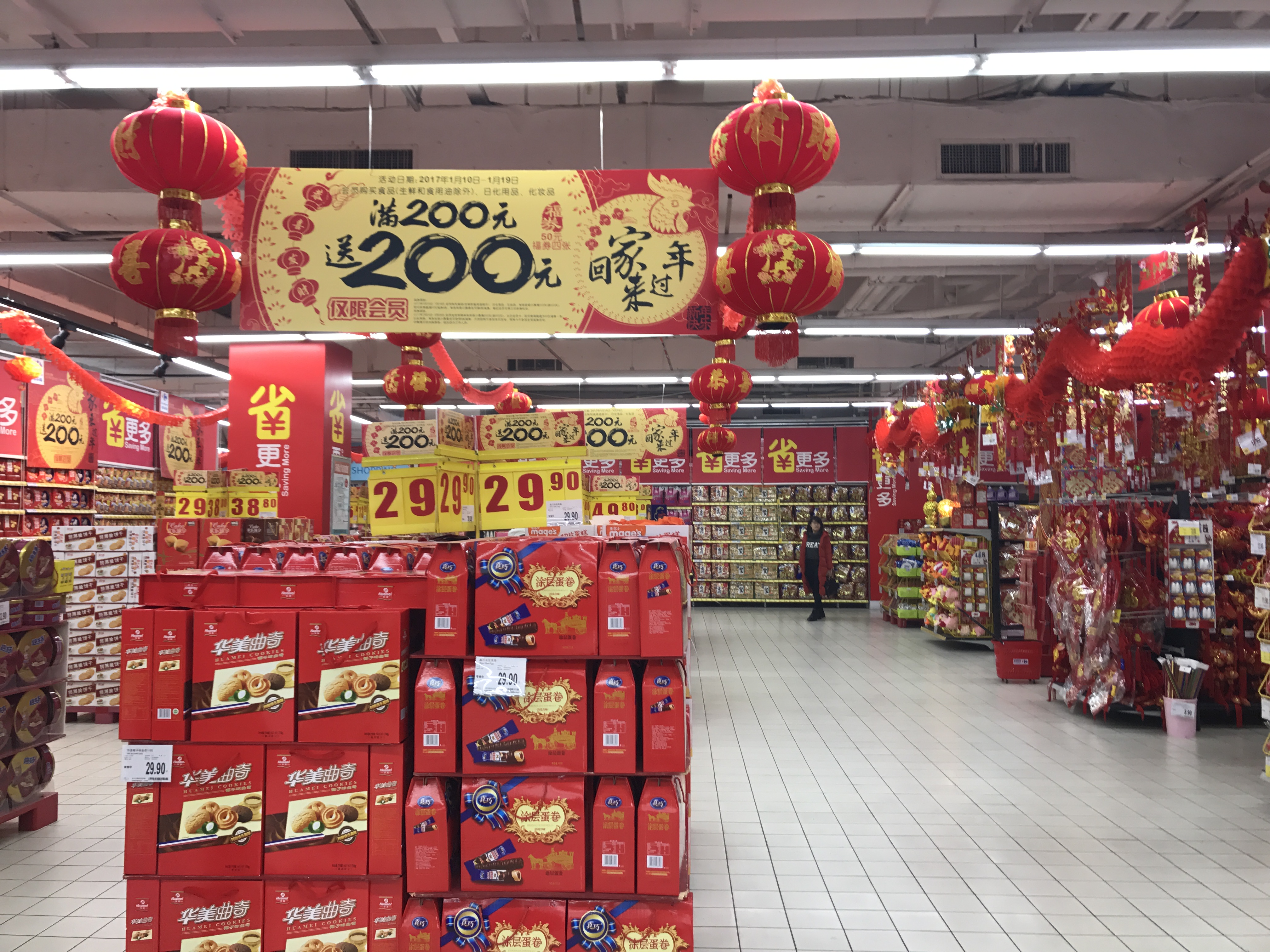 通过记者的走访,这几天,武汉家乐福各门店已能感受到浓浓的节日氛围,卖场内火红的灯笼、对联布置在入口最显眼的区域,琳琅满目的年货摆在中央走道上,配上欢快的新年音乐,整个卖场一片红红火火、喜气洋洋。