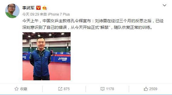 李武军在自己的微博中写道:“今天上午,中国女乒主教练孔令辉宣布:刘诗雯在经过三个月的反思之后,已经深刻意识到了自己的错误,从今天开始正式“解禁”,随队恢复正常的训练。”