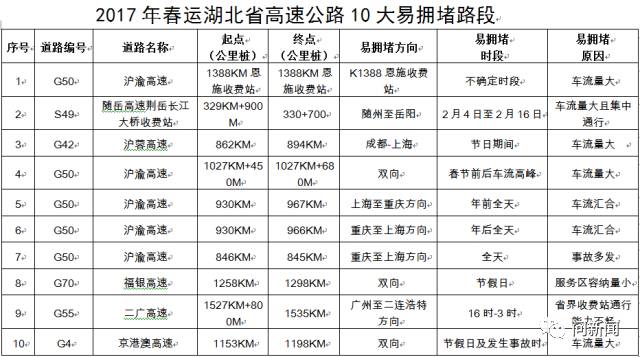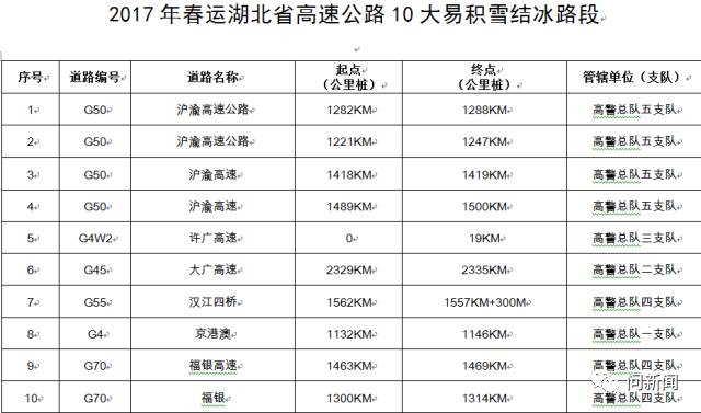 湖北省公安交管局同时公布了春运期间高速公路10大易积雪结冰路段、10大易拥堵路段。其中G50沪渝高速拥有4处易积雪结冰路段和5处易拥堵路段,经行该路段的司乘人员需格外注意。