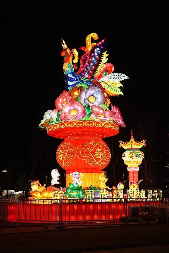 在园博园东门广场,记者一眼就能望到一只五彩缤纷的金鸡赫然屹立在广场正中。作为本次花灯会的主灯组——金鸡报晓,它是所有灯组中最高的,高达15米,炫彩夺目,堪称“高大上”!还有长53米,高14米的羽扇纶巾灯组,树立在楚水湖中,和长江文明馆前的春暖花开巨型花灯屏风交相辉印。湖水倒映着灯光,一动一静,动静结合,让整个园区都“活”了起来。记者了解到,本届花灯会无论在灯组规模还是数量上较之去年都有巨大提升,灯组数量从80组增加到110余组。