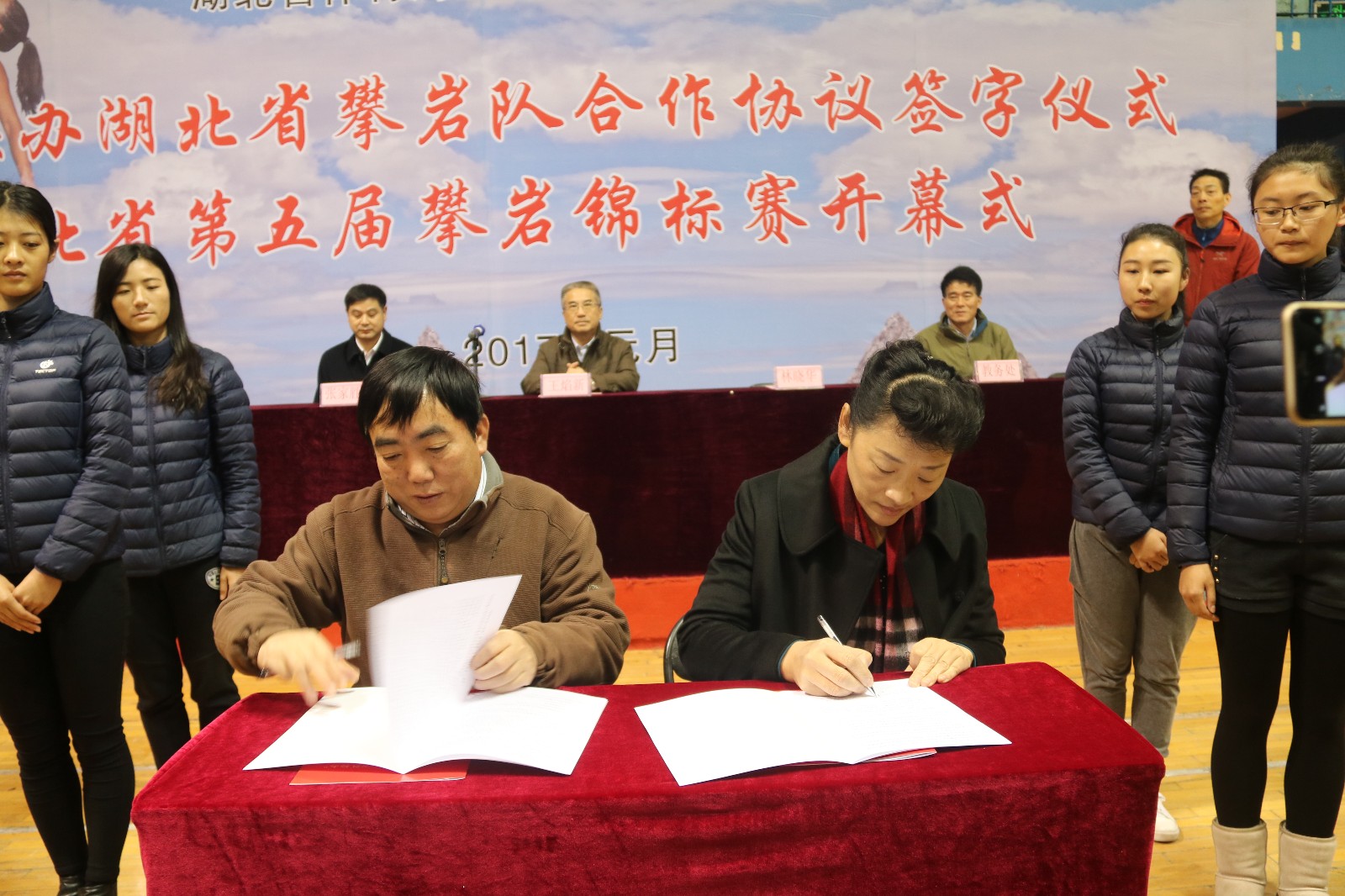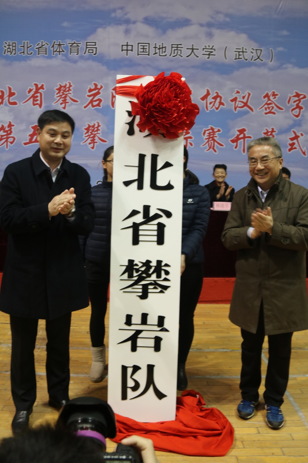仪式现场,湖北省体育局副局长林晓华、地大副校长赖旭龙代表双方进行了签约。省体育局局长张家胜、中国地质大学校长王焰新为本次活动揭牌。随后,省体育局局长张家胜进行讲话,并宣布湖北省第五届攀岩锦标赛开幕。