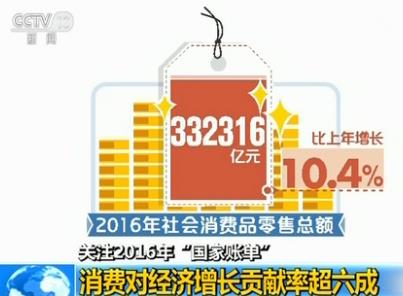 国家统计局公布的数据显示,2016年社会消费品零售总额332316亿元,比上年增长10.4%。对经济增长的贡献率达到64.6%,较上年提升4.7个百分点。消费需求仍然是促进经济稳定增长的“火车头”。