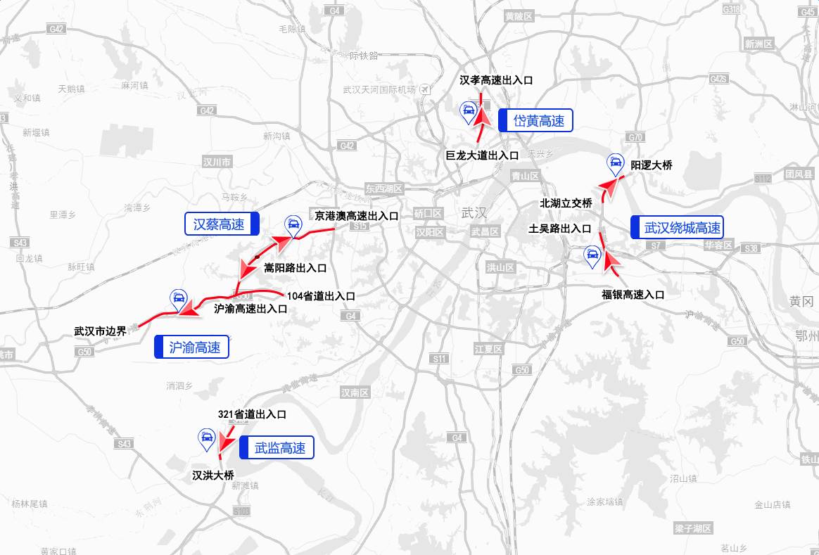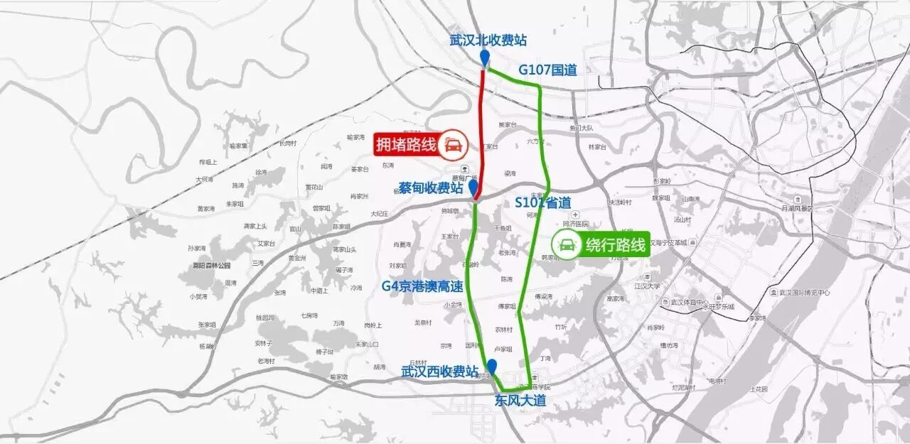 绕行路线:沪渝高速渝沪方向行驶的车辆,从武汉西收费站下站,行驶东风大道行驶至S101省道,再驶入个G107国道进入武汉北收费站。