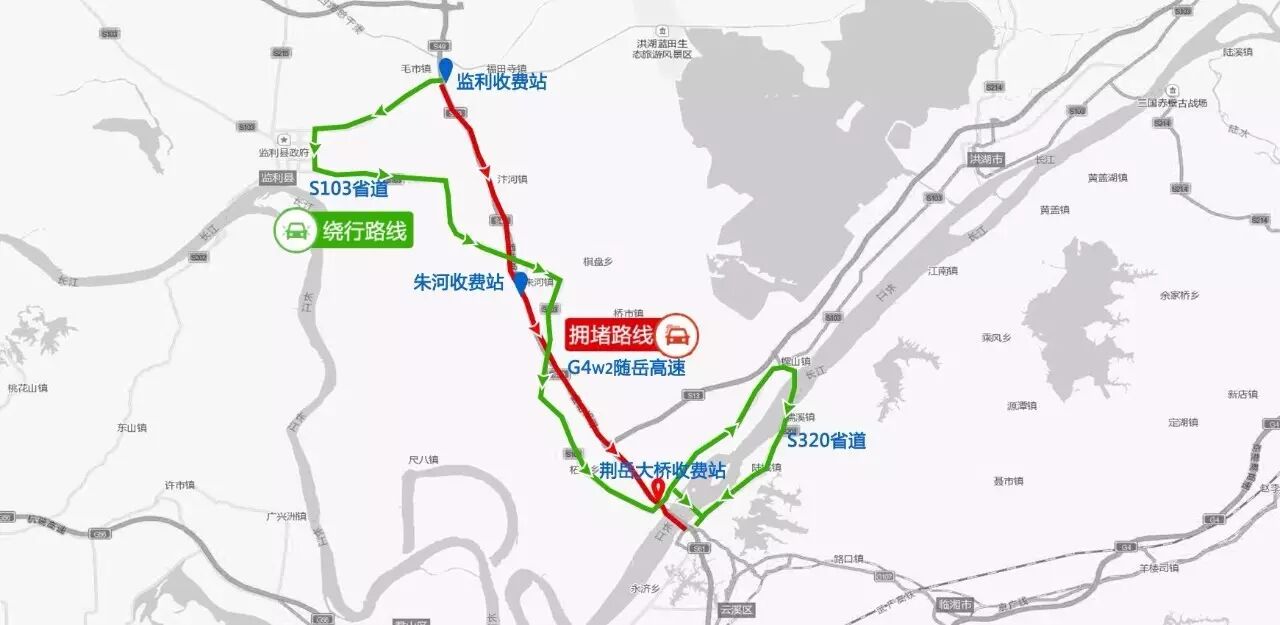 绕行路线:往随岳高速随岳方向的车辆从监利收费站下站,行驶S103省道,选择轮渡进入湖南境内;进入湖南境内可选择S302省道行驶。返程也可以选择此绕行路线。
