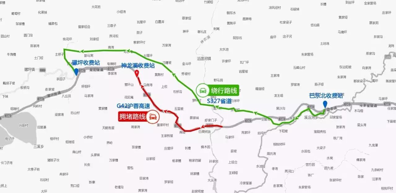 绕行路线:往沪蓉高速沪蓉向的车辆,从巴东北收费站下站,行驶S327省道进入重庆境内。返程也可以选择此绕行路线。