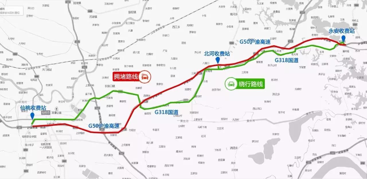 绕行路线:沪渝高速汉宜方向车辆从永安收费站下站,行驶G318国道,行驶至仙桃收费站上站。返程也可以此绕行路线。