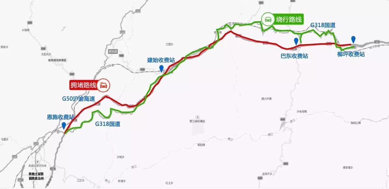 绕行路线:沪渝高速宜恩方向车辆从榔坪下站,行驶G318国道,从恩施收费站上站。返程也可以选择此绕行路线。