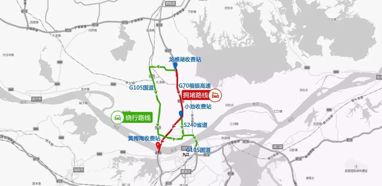 绕行路线:往福银高速银福方向的车辆,从龙感湖下站,行驶G105国道,驶入九江一桥(至允许7座以下客车通行)进入江西境内;行驶S240省道(G70福银高速黄小端复线)驶入九江一桥进入江西境内。返程也可以选择此绕行路线。