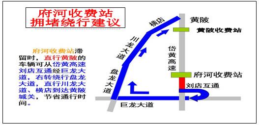 返城时,由麻城、红安方向进入武汉城区的车辆,建议从汉英高速巨龙互通下匝道,从巨龙收费站驶离高速,通行汉口北大道,往西驶入汉口、黄陂,往东驶入武昌、汉口、新洲。出城时也可按照绕行路线行驶。