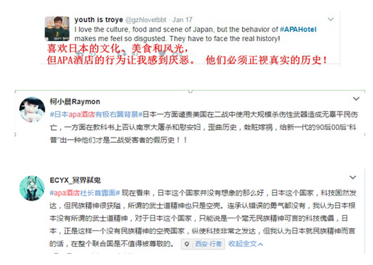 日本APA酒店放置否认南京大屠杀和慰安妇历史的书籍被曝光后,酒店老板元谷外志雄不但不悔改,甚至在21日对右翼书籍事件的首次回应中,叫嚣称绝不撤书。元谷的恶劣言行进一步引发了各国网友的强烈愤慨。