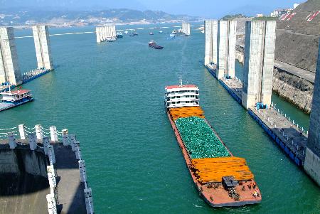 早上8点,三峡北线船闸上下游的检修门和浮门关闭,将江水挡在闸室之外。在船闸里的江水被逐步排干后,检修工作正式开始。据了解,三峡工程从2003年6月开始蓄水通航,截至目前已满负荷运行近14年,运送货物9.94亿吨,旅客1181万人次,发挥了巨大的航运效益。此次三峡北线船闸停航检修期间,将采取南线船闸单线运行,保障重点物资优先过坝。