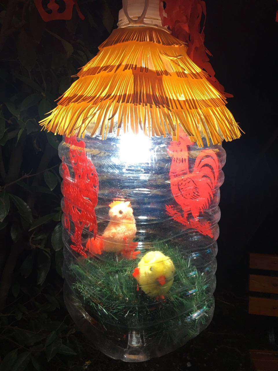 一居委会秉承低碳环保理念,发动苑区小朋友们利用废旧吸管拼装成自行车形状,寓意“绿色出行”,创意十足。孩子们还别出心裁在收集来的废旧油壶上粘上五谷杂粮,制作“五谷丰灯”,用红豆、绿豆、黑米、小米构造成小动物、水果以及中国地图形状,五彩缤纷甚是好看。一居委会书记杨光杰介绍,居委会发动居民用废旧材料做灯盏,不仅新颖有趣,还能变废为宝,达到环保节能的效果。