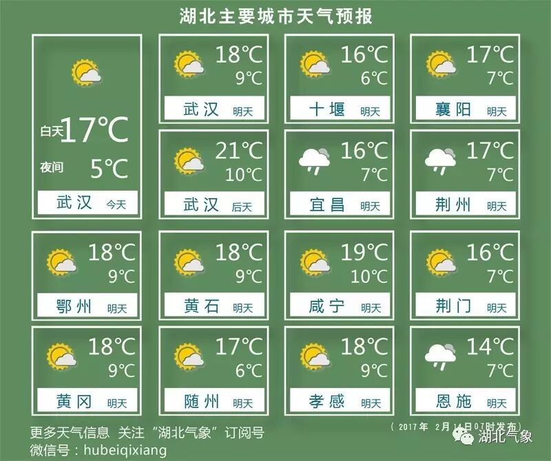 预计今天全省各地最高气温大都有15-17℃,武汉城区高温会升到18℃,出门过节的美眉们,可以甩掉羽绒服,穿上漂亮的裙子和大衣,美美哒。不过恩施地区今天有短时小雨,外出最好带上雨伞哦。