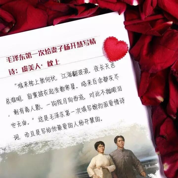 虞美人·枕上:“堆来枕上愁何状,江海翻波浪。夜长天色总难明,寂寞披衣起坐数寒星。晓来百念都灰尽,剩有离人影。一钩残月向西流,对此不抛眼泪也无由。”这是毛泽东第一次填写婉约派爱情诗词,而且是写给他最爱的人杨开慧的。