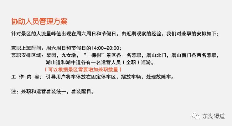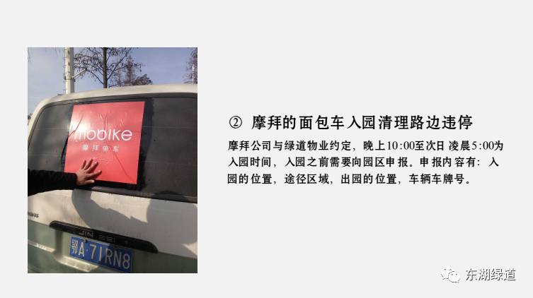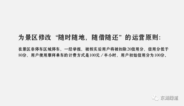 而随后摩拜公司回复了东湖绿道物业管理公司,拿出了《摩拜东湖绿道车辆综合管理方案》,方案中明确提出,将为景区修改“随时随地、随借随还”的运营原则。