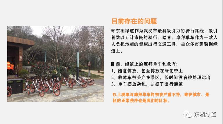 为此,今年元月上旬,武汉东湖绿道物业管理公司主动与摩拜公司联系,表示欢迎摩拜单车进入绿道,指出了其目前存在的问题,希望其加以改进,我们愿意为其提供便利。