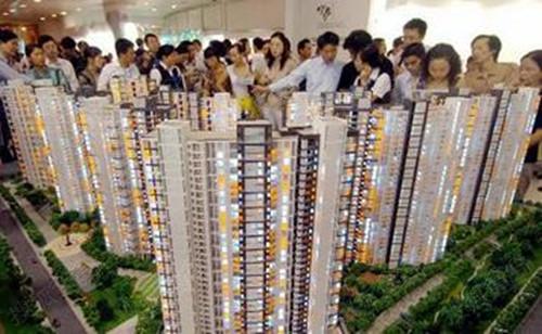 图为12日,在武汉光谷一售楼中心内,市民正在看楼房模型。
