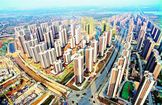 图为15日,在武汉光谷左岭附近不少楼盘正在建设中。