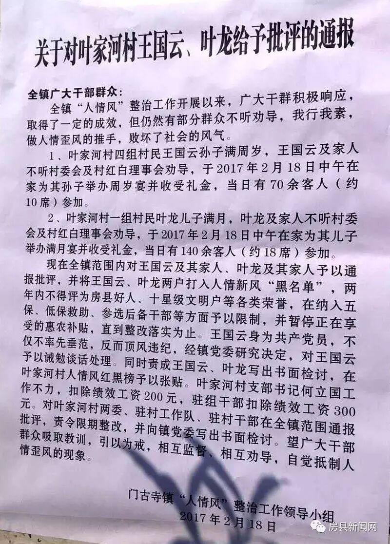 一是成立了“人情风”领导小组,定期进行巡检,对顶风违规的党员干部报请纪委处理,对百姓违规者在媒体曝光。