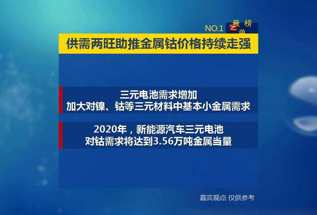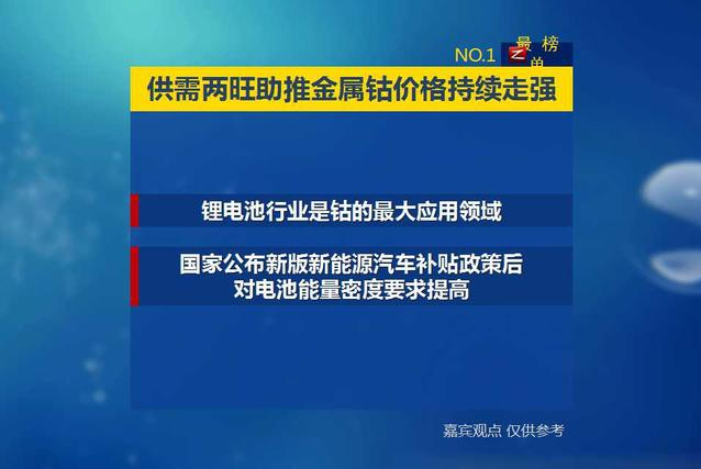 金属钴价格的上涨可以从供需两方面找到原因。需求端当前锂电池行业是钴的最大应用领域,在国家公布新版的新能源汽车补贴政策后,为了获得高档补贴,车厂对电池的能量密度要求提高,三元路线迅速走俏,短期内导致电池商加大了对镍、钴等三元材料中基本小金属的需求。