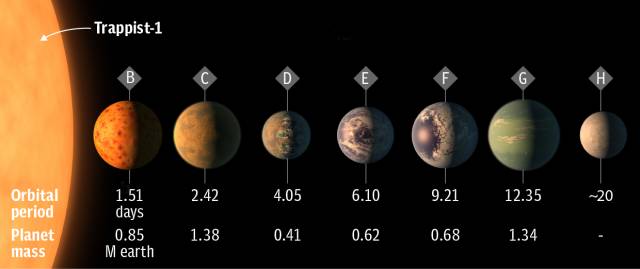 TRAPPIST-1最靠内的行星是TRAPPIST-1 b,它的轨道周期只有1.5天,而最外面的行星TRAPPIST-1 h轨道周期约为20天,比水星离太阳的距离还近。科学家认为,像TRAPPIST-1的这种恒星-行星系统可能在我们的宇宙中占主流,而我们太阳系反而是个例外。