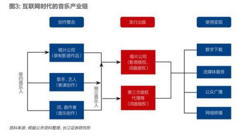 在传统音乐产业链上,唱片公司位居核心。当时全球市场是五大唱片公司主导——华纳、BMG、EMI、Sony、环球。中国内地的唱传统唱片公司是以OP(Original Publisher,片公司起初难以与之抗衡,后来凭借对本土市场的熟悉,逐渐发展壮大。涌现出红星音乐社、华谊音乐、太合麦田、海蝶音乐等唱片公司,其中以太合麦田和华谊音乐两大公司最具代表性。此外,保利、中信等央企巨头也成立文化公司涉足音乐市场。