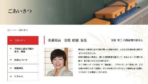 “安倍晋三纪念小学”网站主页上安倍昭惠的照片和致辞截图。