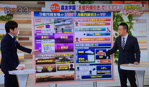 日本朝日电视台早间节目聚焦森友学园低价购买国有土地问题。图片来自网络