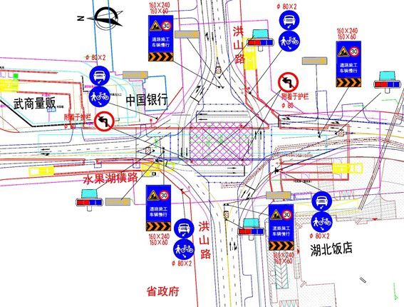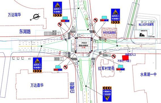 洪山路东一路路口四个方向将采取禁止机动车左转措施。