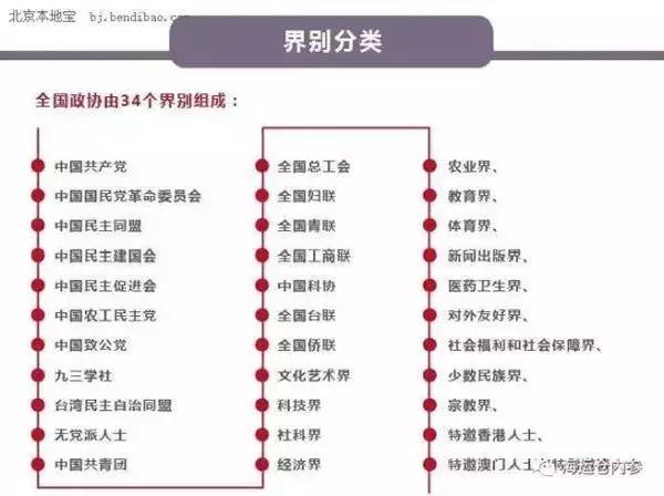 目前全国政协共设置有34个界别,其中党派类10个、团体类8个、界别类13个、特邀类3个,基本涵盖了社会各阶层、各方面。