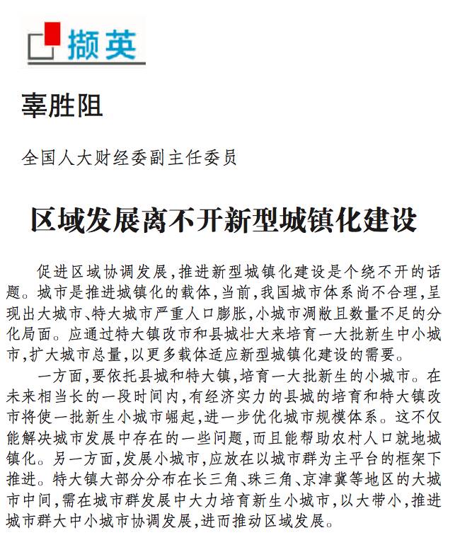 3月5日,《经济日报》登载全国人大代表、全国人大财经委副主任委员辜胜阻关于新型城镇化建设的相关言论。