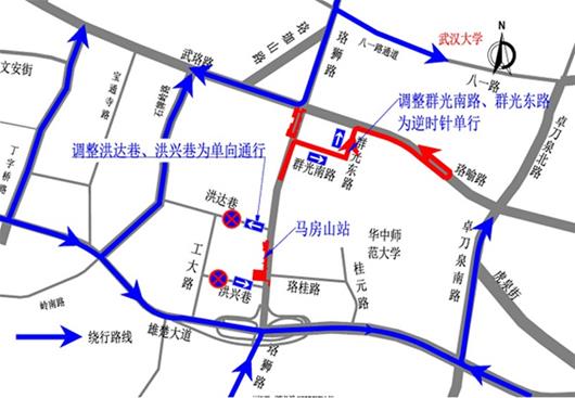 沿珞狮路由北向南的机动车,可通过洪达巷,绕行工大路、洪兴巷,避开马房山站施工区域。