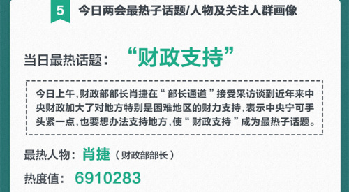 据“UC数读舆情”统计(统计时间:2017年3月11日16时到3月12日16时),12日两会最热子话题是“财政支持”;最热人物是财政部部长肖捷。80后仍为最关注两会新闻的人群。