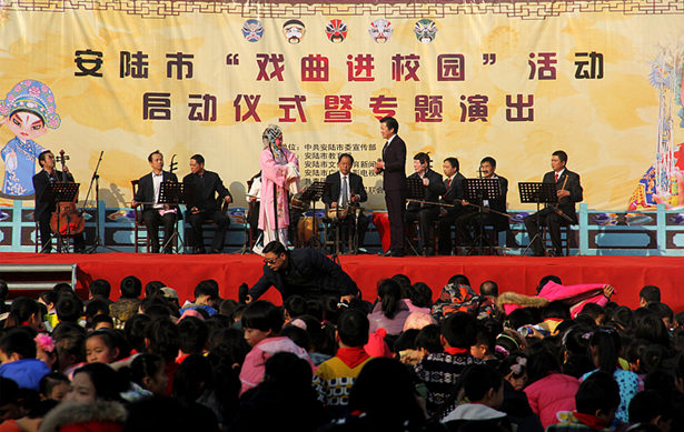 湖北省文化厅会同省教育厅,分大学组、中学组和小学组3个组分别开展了全省校园戏曲展演活动。42个学校的1000余名学生票友,登台表演了京剧、汉剧、楚剧、花鼓戏、黄梅戏等戏曲剧种,咿呀戏曲调成为校园文化的一道亮丽风景线。