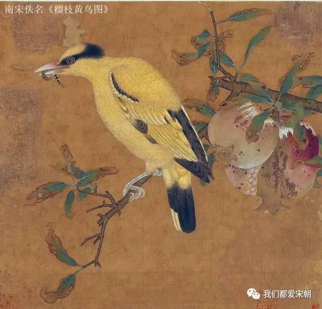 另一幅南宋佚名的《榴枝黄鸟图》(北京故宫博物院藏),画面出现的是石榴。石榴也是宋人常见的水果,杨万里有《石榴》诗咏道:“雾縠作房珠作骨,水精为醴玉为浆。”因石榴多籽,也常作为“多子多福”的象征出现在宋人画作中。