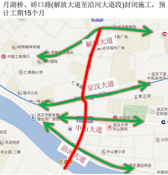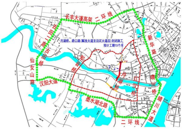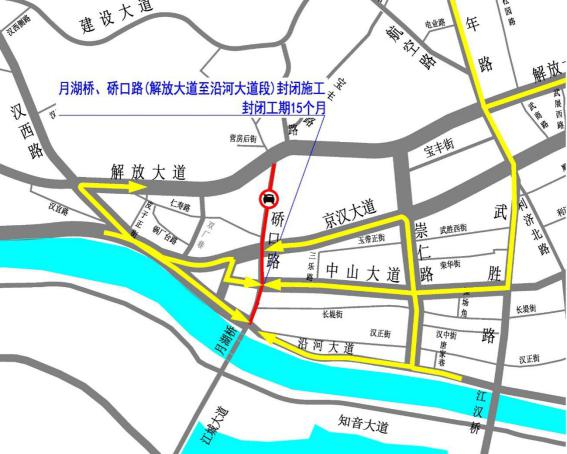 江汉四桥、宝硚工程即将同步封闭施工,施工期间封闭月湖桥、硚口路(解放大道至沿河大道段)交通,预计工期15个月;封闭施工期间月湖桥禁止机动车通行,允许行人、非机动车通行;封闭施工期间允许车辆东西向通行,即保留京汉大道、中山大道、沿河大道东西通道。