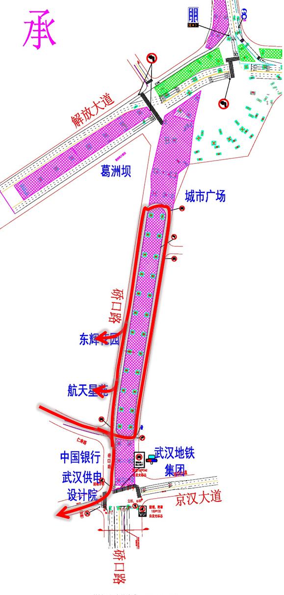 ②由东向西,绕行通道为崇仁路、沿河大道、中山大道、京汉大道。