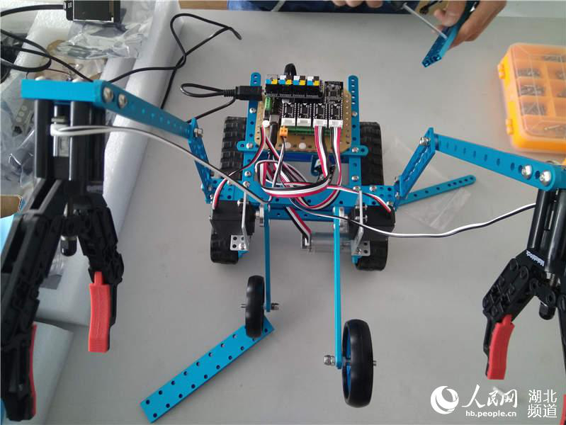 据了解,他们设计的这个按摩机器人身形小巧,由电源、线路、控制程序和接受模块等几个部分组成,以mBOt小车作为底座方便移动,通过支架零件固定两个机械手和两个小轮。吕新悦介绍,机械手模仿手臂运动,使机械手开合达到捏背的目的,机械手是按摩机器人的主要执行部件,通过按摩机器人的操作,可以选择捶背、捏肩或者又捶背又捏肩的程序,而小轮上下运动则是模仿捶背的动作。