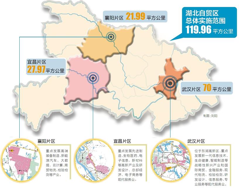 根据《中国(湖北)自由贸易试验区总体方案》,湖北自贸区将探索六大类19项改革事项,全力打造区域经济发展新引擎,为全面深化改革和扩大开放探索新途径,形成可复制可推广的经验。《方案》提出,湖北自贸区要以制度创新为核心,立足中部、辐射全国、走向世界,成为中部有序承接产业转移示范区、战略性新兴产业和高技术产业集聚区、全面改革开放试验田和内陆开放新高地。湖北自贸区实施范围119.96平方公里,涵盖3个片区:武汉片区70平方公里(含东湖综保区5.41平方公里),襄阳片区21.99平方公里(含襄阳保税物流中心〔B型〕0.281平方公里),宜昌片区27.97平方公里。