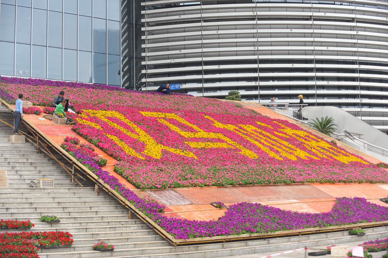 图为:湖北省图书馆门前主题为“汉马加油”的大型摆花(记者万多摄)