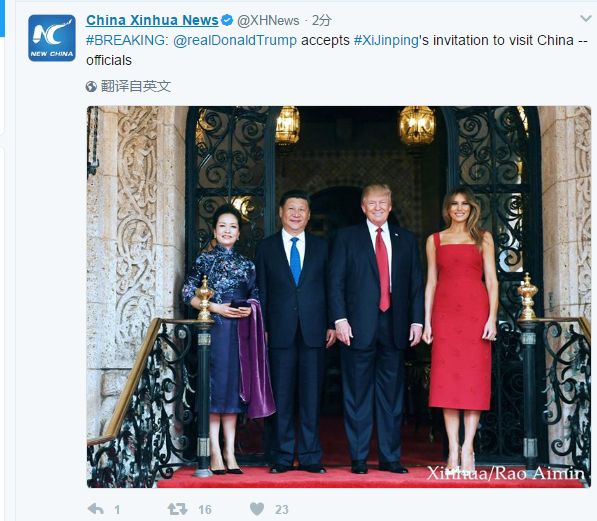 美国总统特朗普接受国家主席习近平提出的访华邀请。