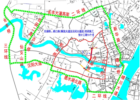 原标题:出行参考|周六起月湖桥、硚口路施工 机动车禁止通行