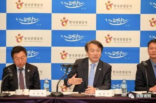 4月12日,韩国观光公社社长郑昌洙(中)在记者会上答问