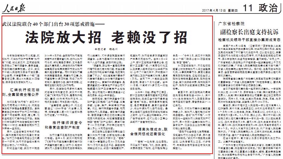 这不,今天的《人民日报》政治版,就点名表扬咱武汉法院联合40个部门放出的大招啦!