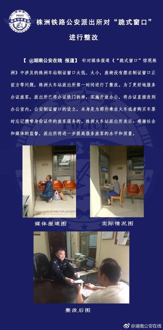 同样,针对株洲火车站制证窗口太低、座椅没有摆在制证窗口正前方等问题,湖南省公安厅官方微博18日下午发布消息称,湖南株洲火车站派出所第一时间进行了整改,派出所已将办证铁门拆掉,实施开放办公。
