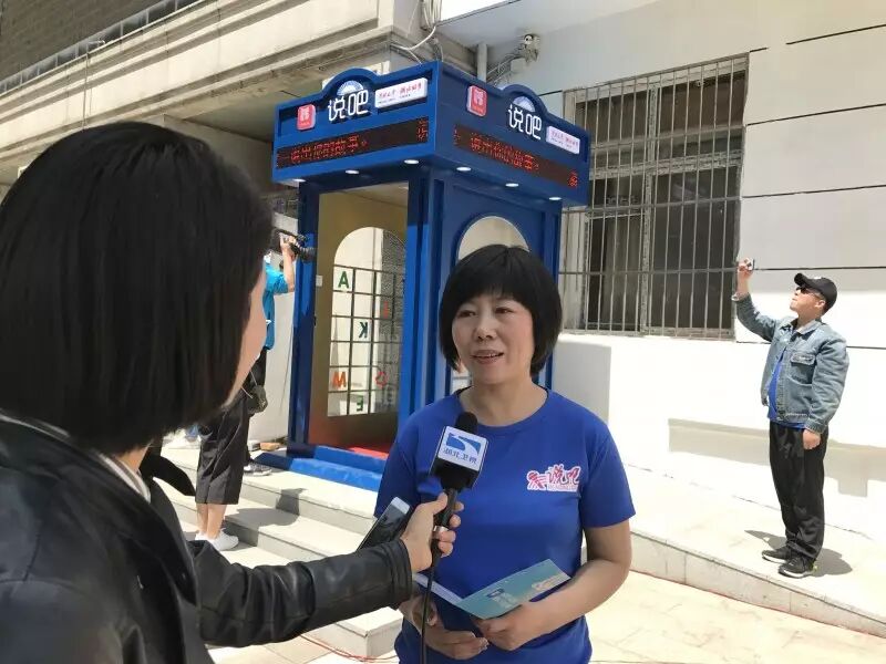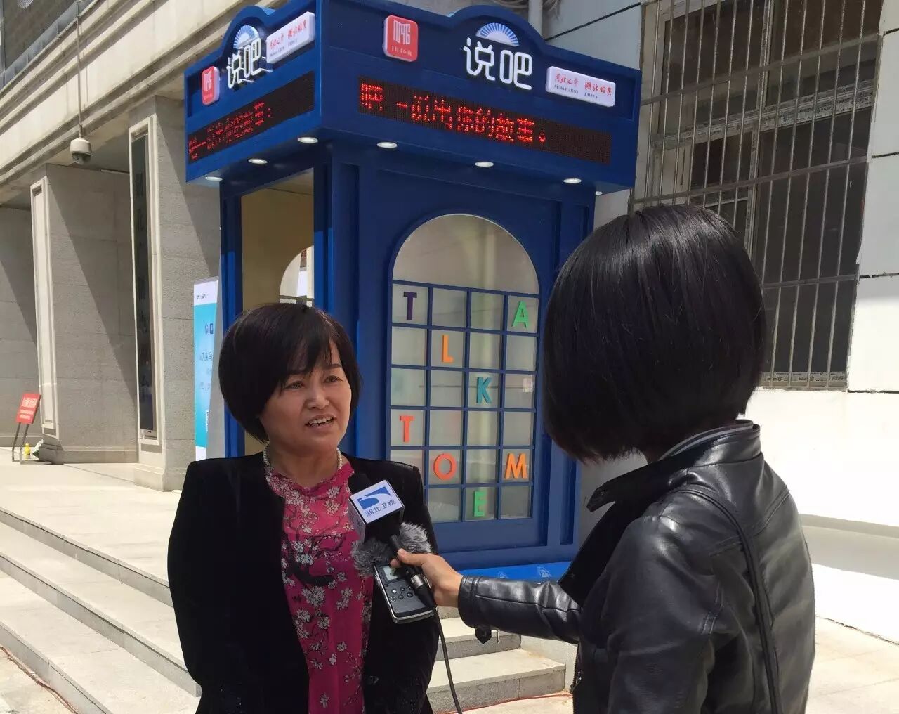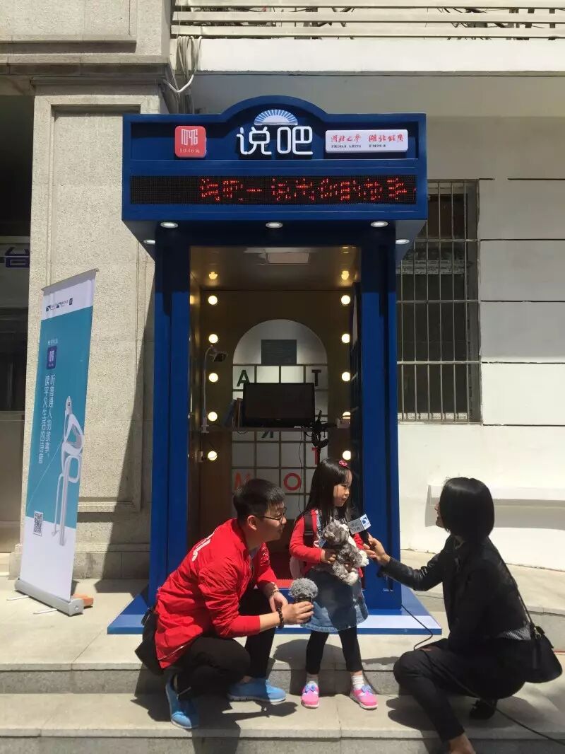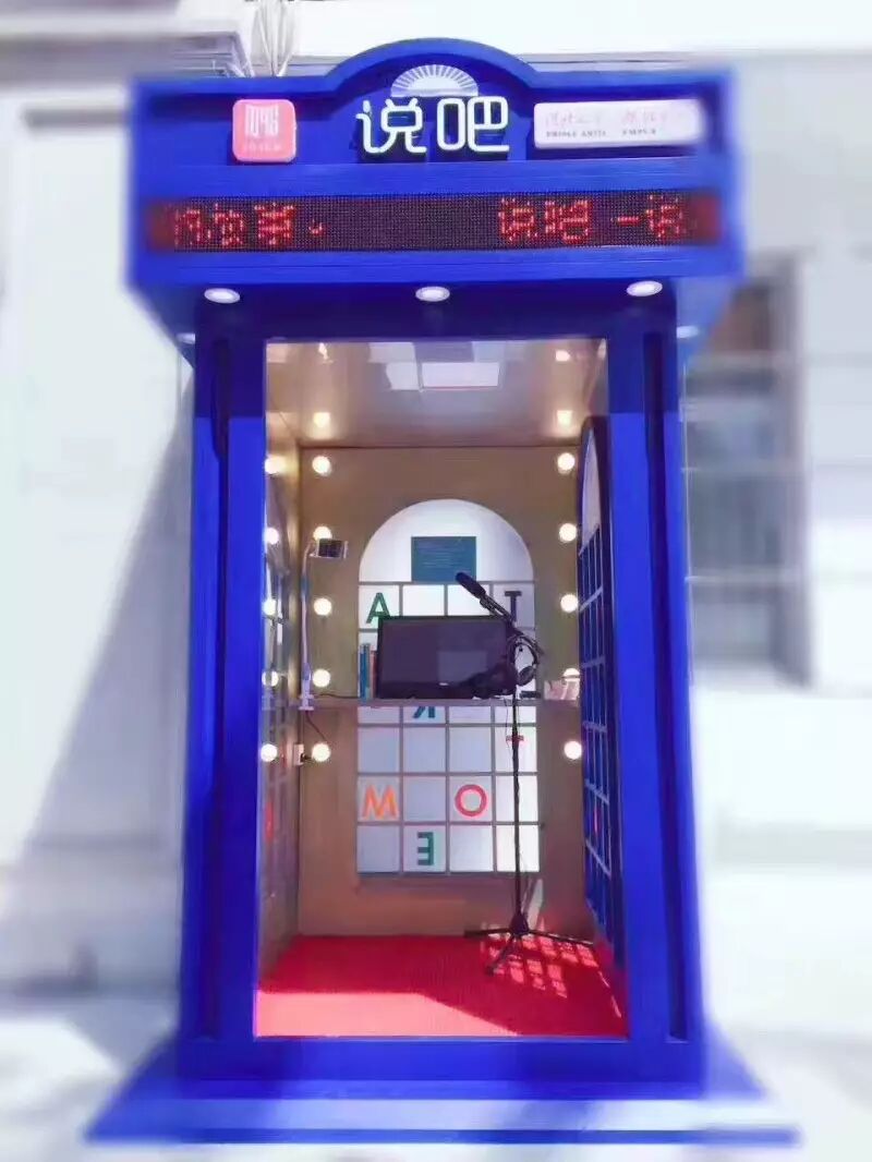 一个宝蓝色的小亭子 “说吧”赫然呈现在眼前,清新的外观、独特的功能吸引了不少市民排队尝鲜。走进“说吧”,书香萦绕,桌上有专业的录音设备,并安装了摄像头。市民根据语音提示,即可开启声音录制,讲述一个故事、读一段文章或者唱一首歌。