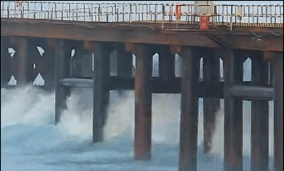 危险!焊接作业时,巨大的海浪拍打在钢管桩上,溅起的浪花五六米高,很容易打湿焊钳,有引发触电的可能。