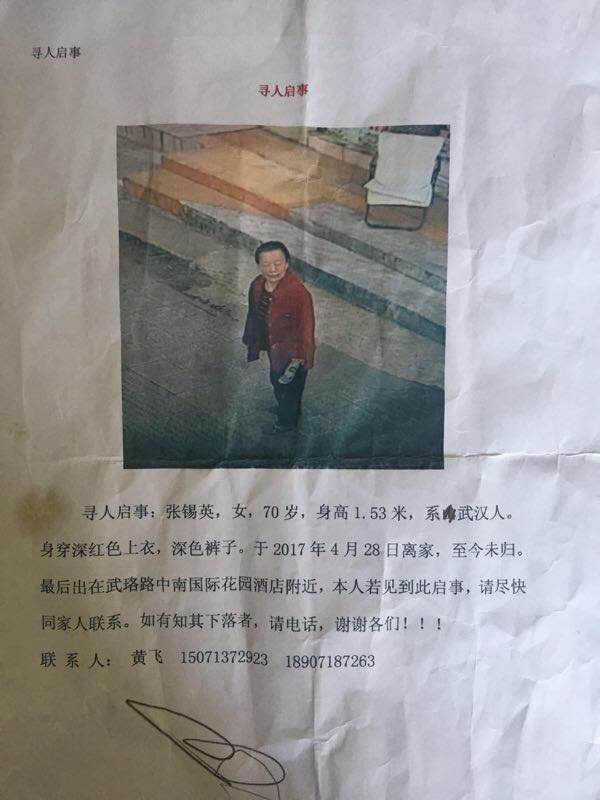 长江云报道 武汉市武昌城管委二桥清洁队队长熊桂兰向媒体求助:该队环卫工黄飞的母亲张锡英于4月28日离家出走至今未归。张锡英也是二桥队退休的一名老环卫工人,今年已经70岁,在环卫岗位工作了26年,患有轻微老年痴呆症,离家时身穿红色上衣,深色裤子。张锡英老人最后出现的地点在武珞路丁字桥中南花园酒店附近,至今未归。
