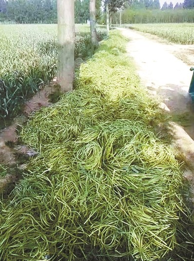 辛苦抽出来的蒜薹遭遇价格暴跌,部分蒜农只能直接将蒜薹扔在河里或者路边。