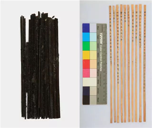 然而,这些珍宝出土之时,却是另一番模样:散成一堆,看上去只是烂泥中黑乎乎、近乎朽腐的竹条木片。